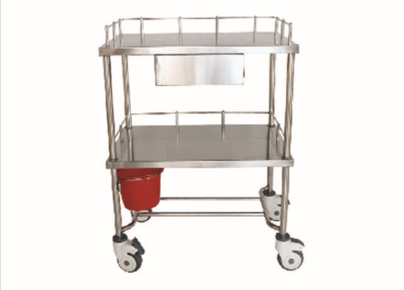 4、治疗车分为上下两层,均带有不锈钢护栏,防止物体滑落。下方配有杂物桶,不锈钢管制作的横撑增加车子稳定性。